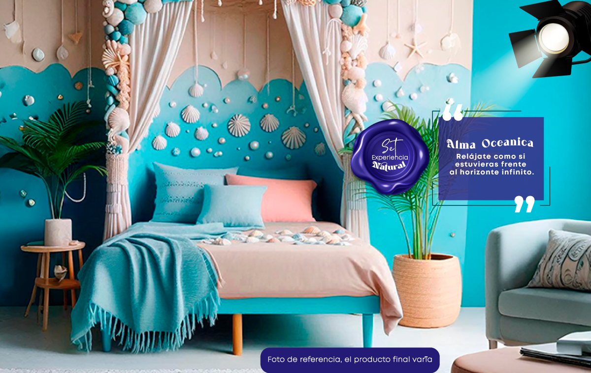 Deja que tu espacio se llene de la tranquilidad del océano donde cada elemento de este conjunto te invita a relajarte como si estuvieras frente al horizonte infinito .